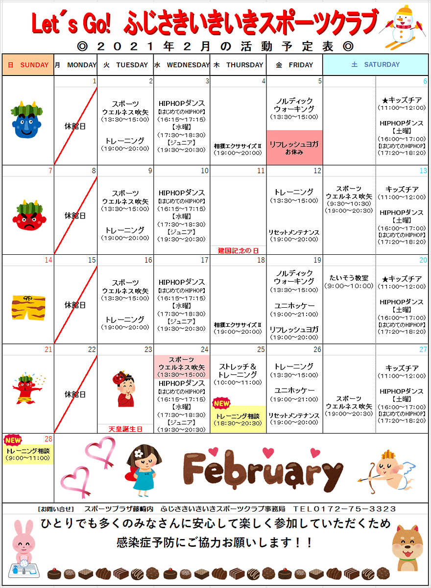 スポーツプラザ藤崎より・2月の休館日・ふじさきいきいきスポーツクラブ 2月の活動カレンダー・2月のトレーニング講習についてお知らせします。スポーツプラザ藤崎・農業者トレーニングセンターのアリーナ利用状況...
